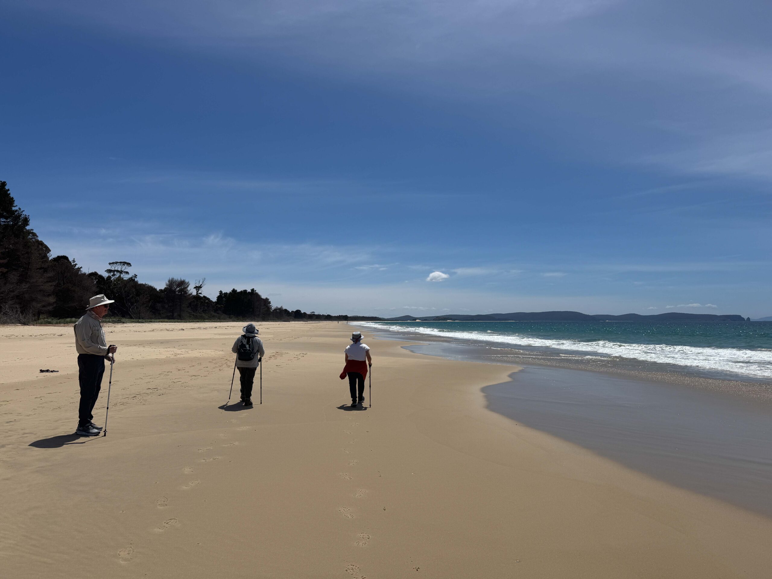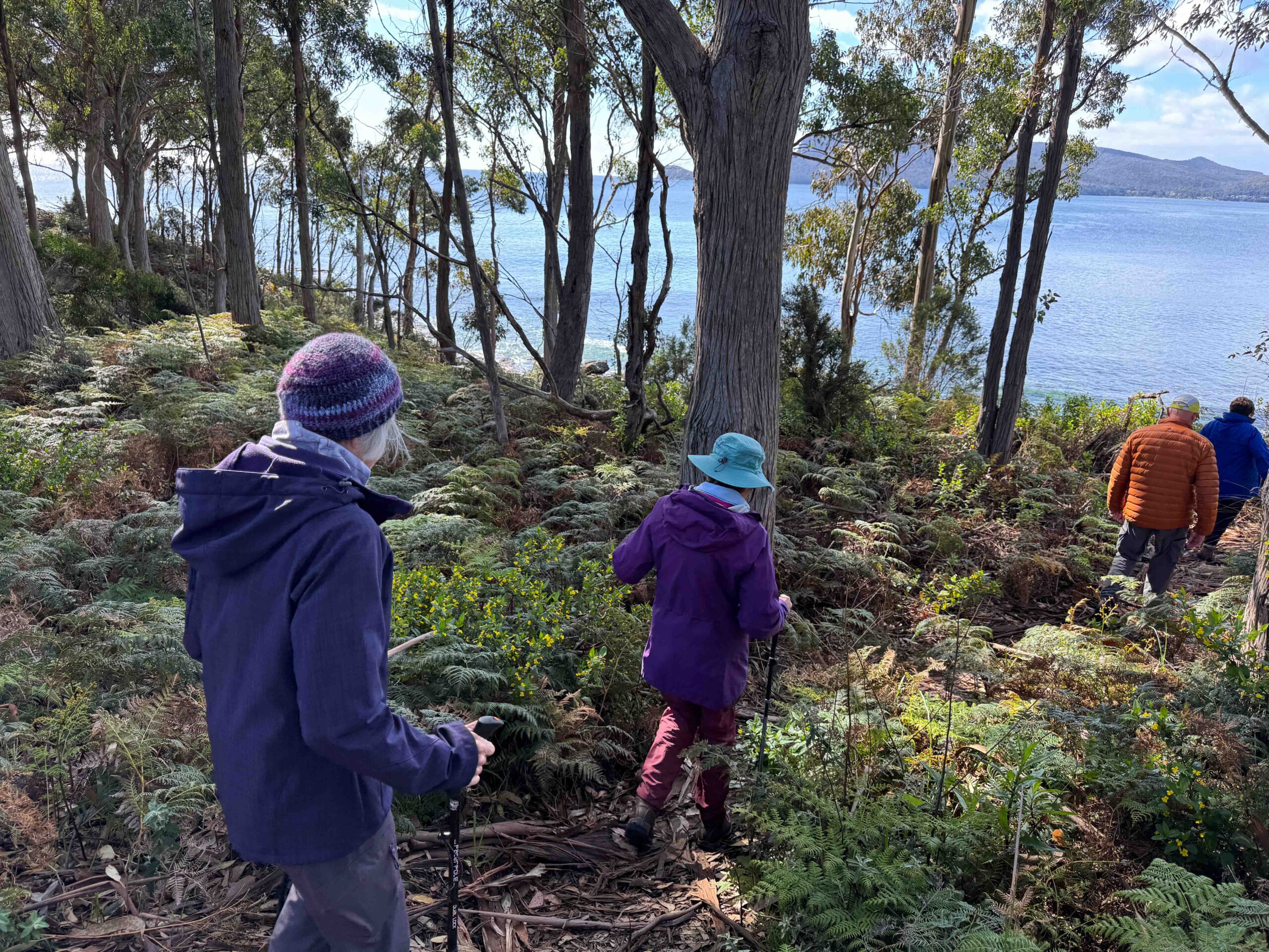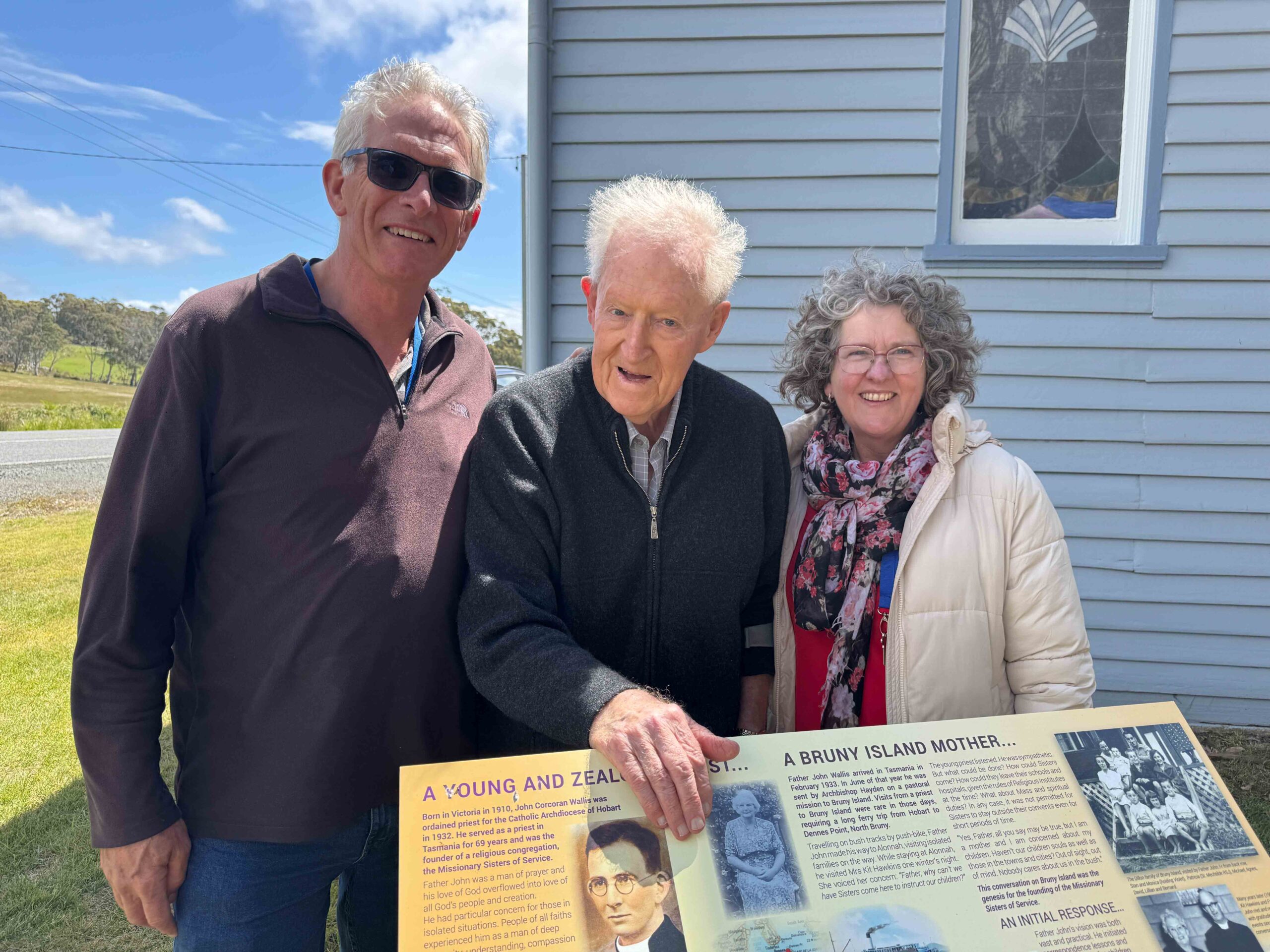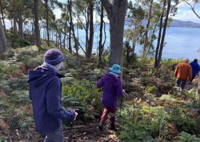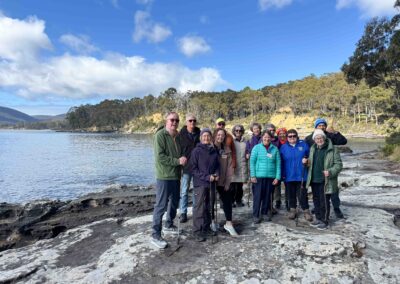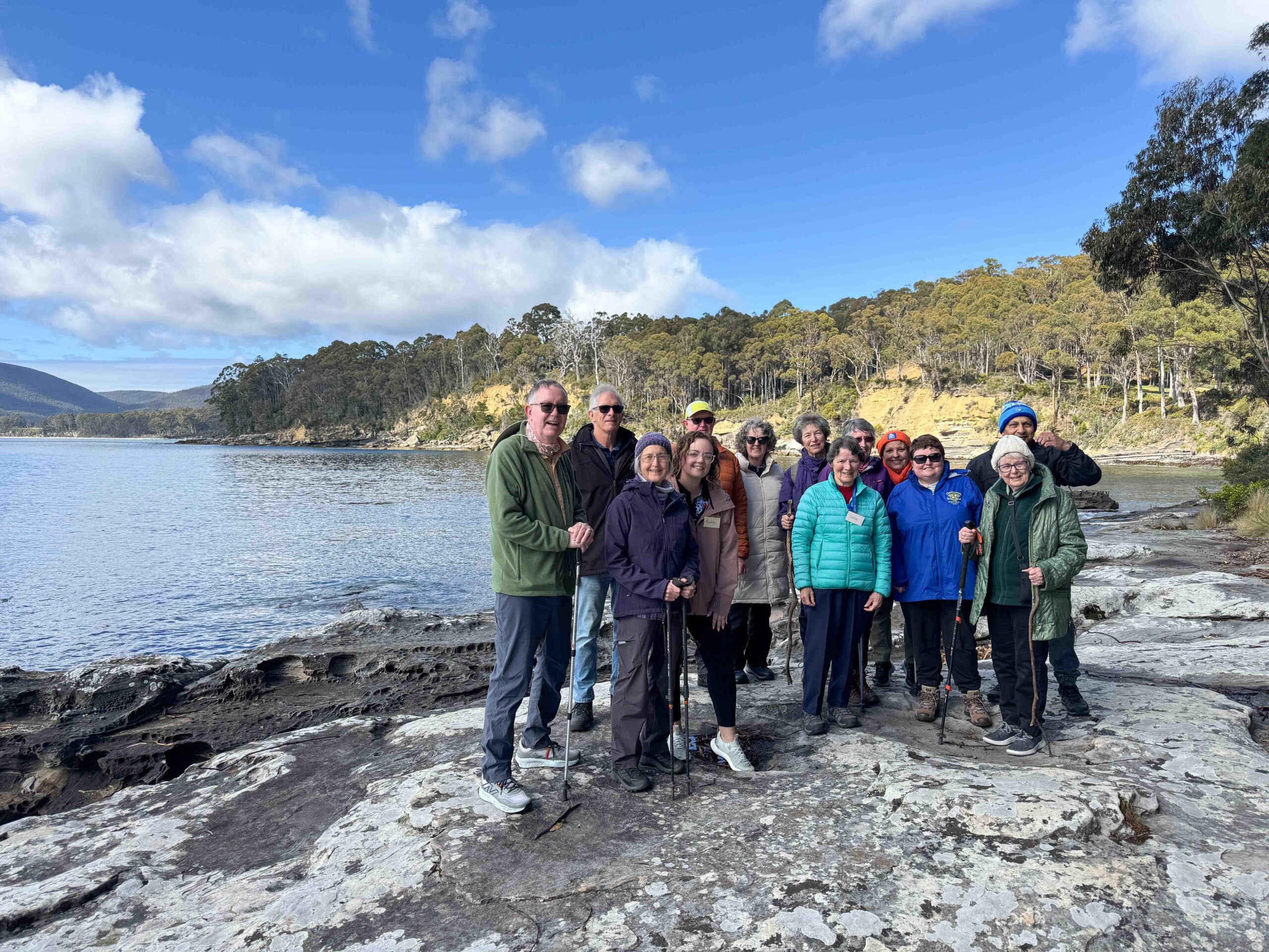 The group also reflected on the early journeys of Fr John Wallis. Participants read excerpts from his letters written in 1933, which described the terrain he travelled and the families he visited across Bruny Island, some of whom had not seen a priest for nine years. They walked along Neck Beach to the tessellated pavement, and some climbed Mount Mangana, the island’s highest peak, while others visited local communities.